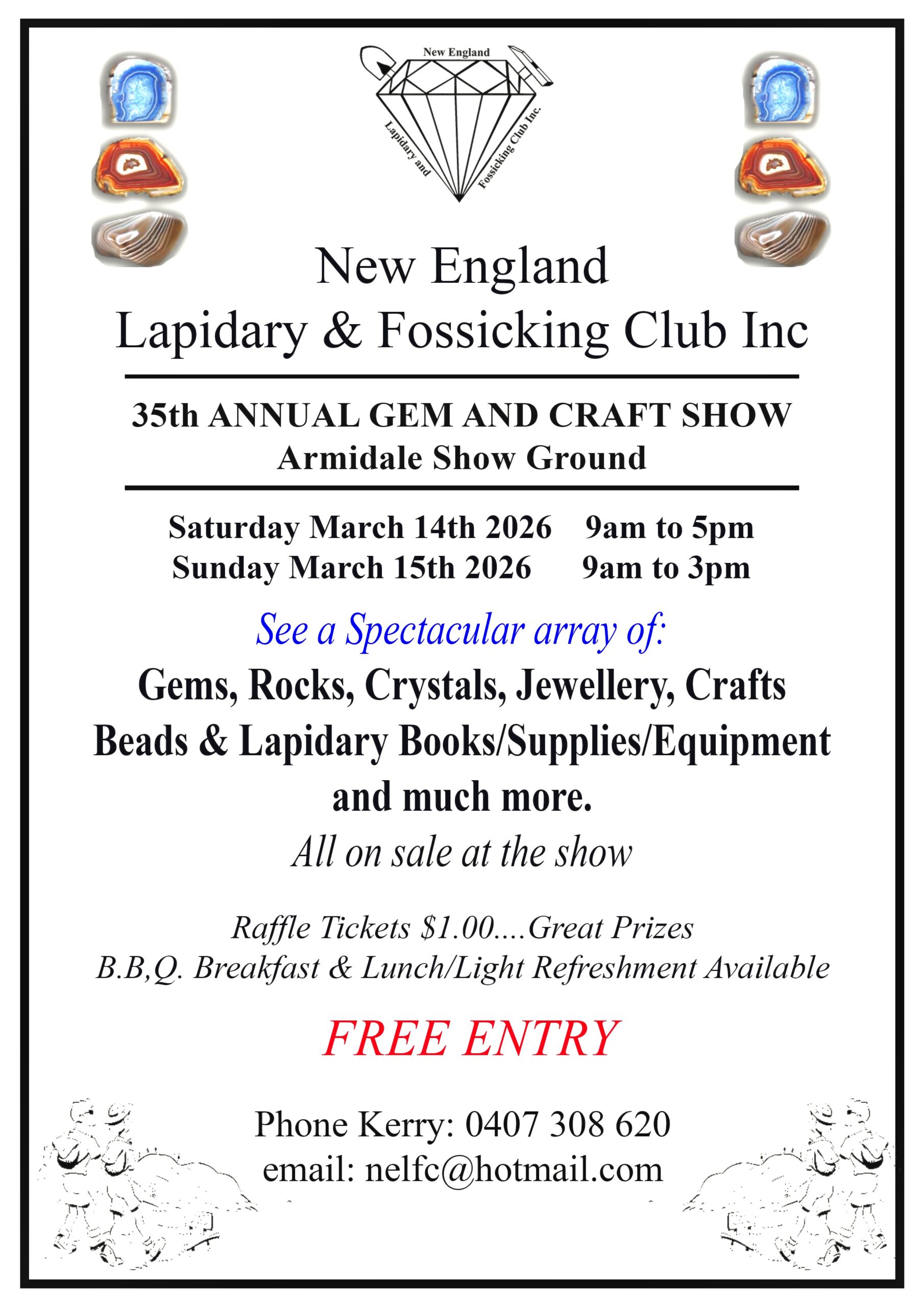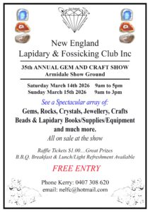 Newcastle Lapidary Clubs annual event with over 40 traders plus club activities.